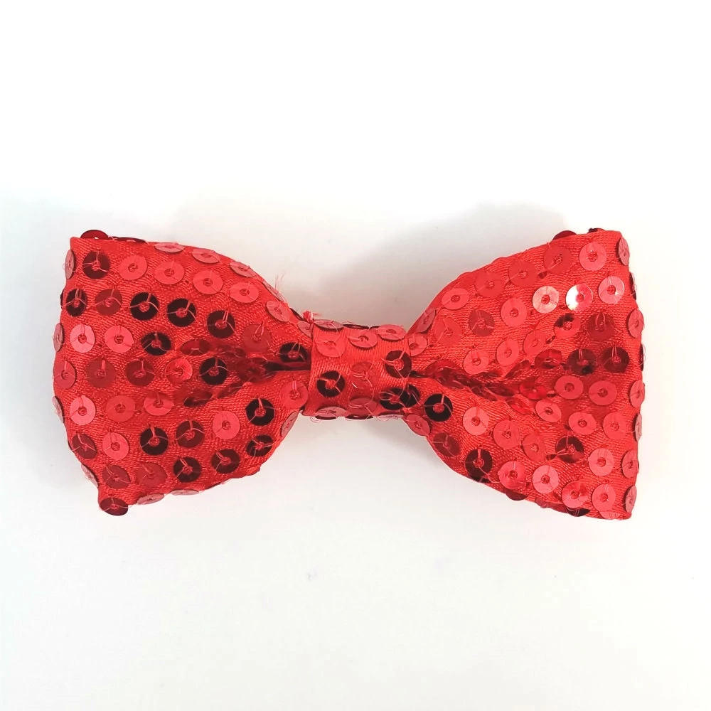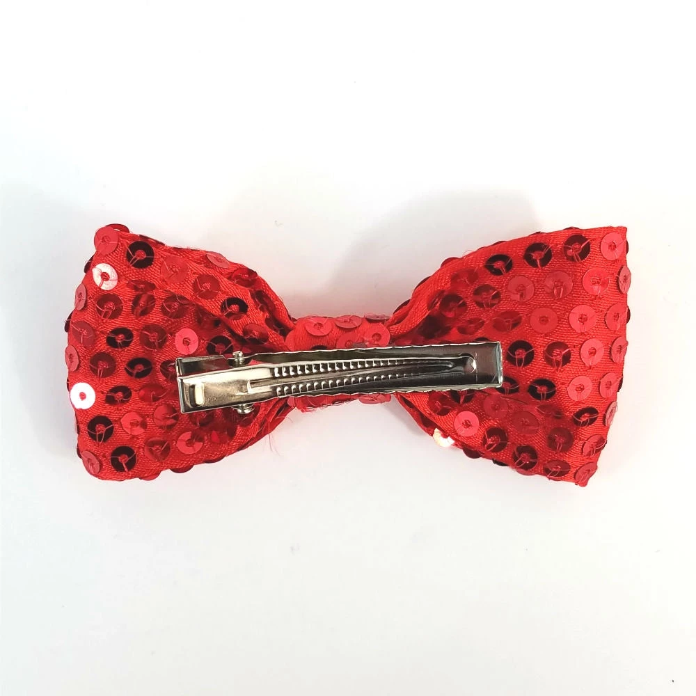 Cute bow hair clip in red satin with shiny sewn-on sequins that really catch the light!