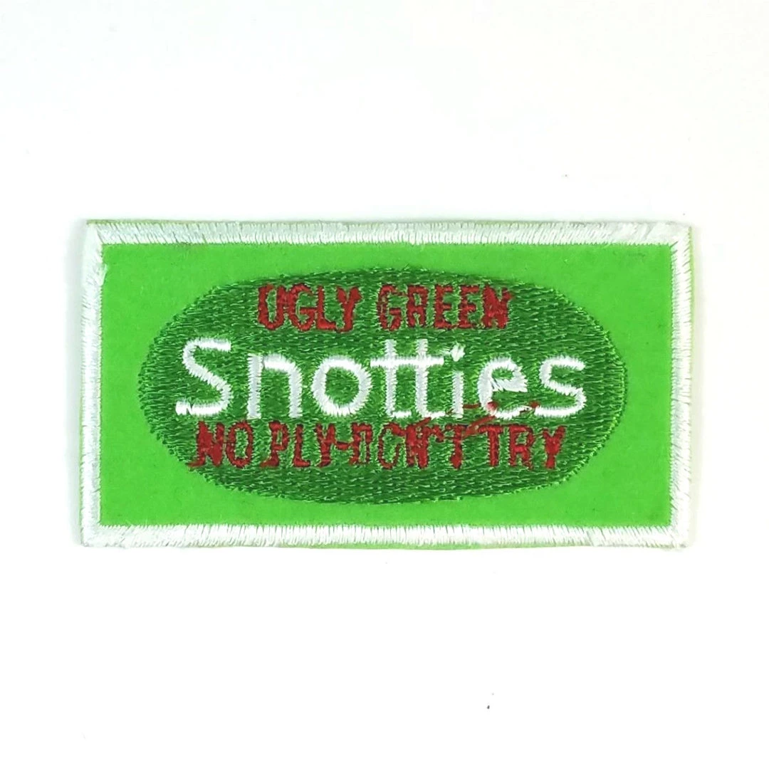 Wacky vintage 1970s deadstock Ugly Green Snotties “No Ply-Don’t Try” spoof product patch