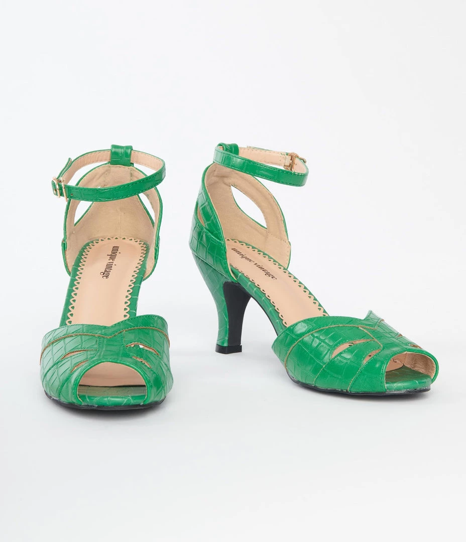 Gorgeous green crocodile pattern ankle strap peep-toe heels from Unique Vintage. This versatile and timeless style will be lovely with retro or modern ensembles, and the open design has the perfect amount of coverage to be worn in any season, yay!