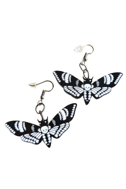 Black with printed white details laser cut acrylic death’s-head hawkmoth dangle earrings.