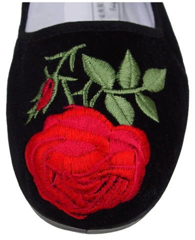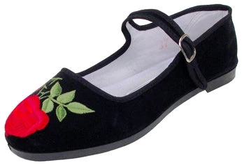 Adorable Mary Jane style black velvet rubber-soled flats with red embroidered rose