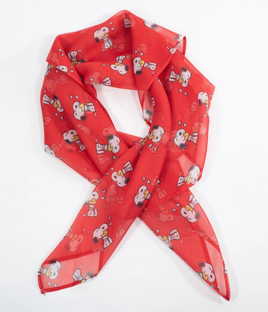Peanuts x Unique Vintage collaboration retro style red background allover hugging Snoopy & Woodstock print 28″ square sheer chiffon scarf –a sweet accessory in your hair or around your neck!