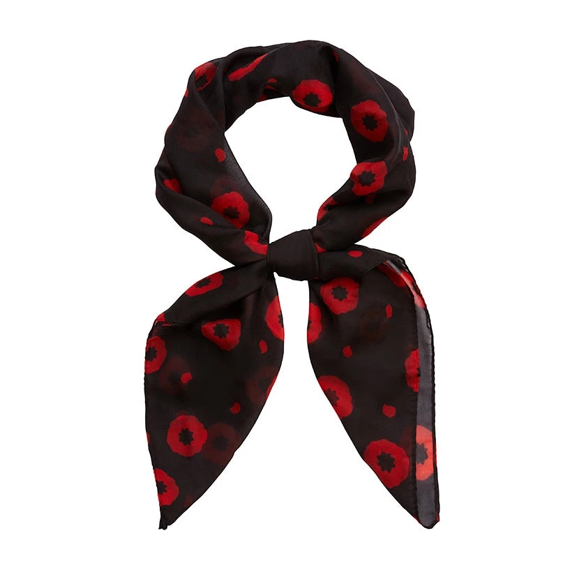 Vintage inspired semi-sheer “Poppy Field” allover red flower print black background scarf, made by Erstwilder