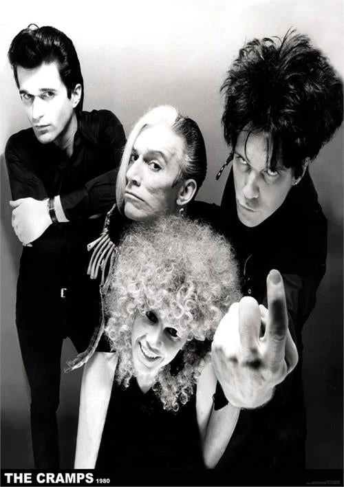 Black & white photo of The Cramps classic 1980 lineup of Poison Ivy, Lux Interior, Bryan Gregory and Nick Knox, showing a come-hither gesture from Lux and Ivy’s lovely (and elusive!) smile