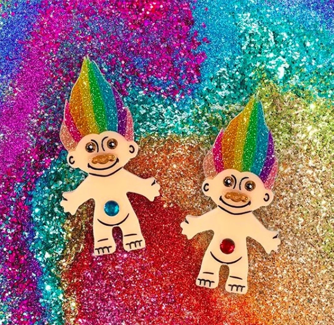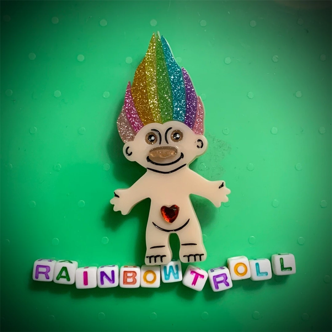 Lipstick & Chrome x Candy Doll Club “Rainbow Troll” layered laser cut resin brooch. Like their inspiration dolls, each troll has different shape and color belly button gem –cute!
