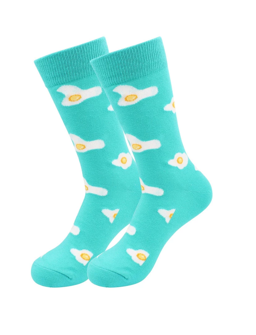 Fried Eggs –on the menu, and on your feet! Allover over-easy eggs print soft and comfortable sky blue cotton blend crew socks, made by Real Sic