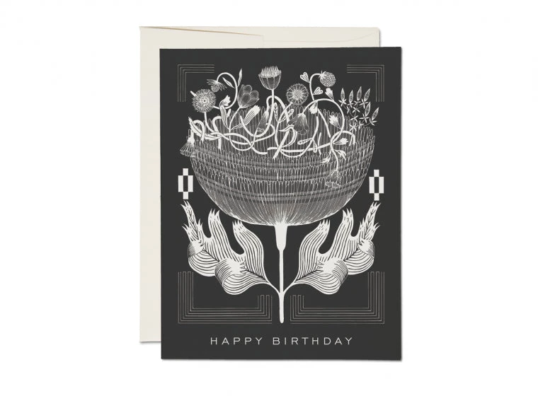 “Happy Birthday” black and white poppies and clover with geometric design heavyweight card stock offset printed note card, illustrated by Marsha Robinson.Â