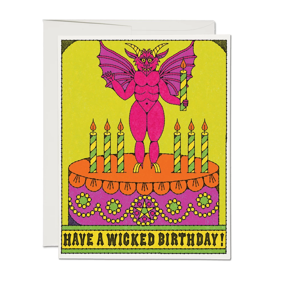 “Have a Wicked Birthday!” heavyweight card stock offset printed note card, illustrated by Nolan Pelletier.