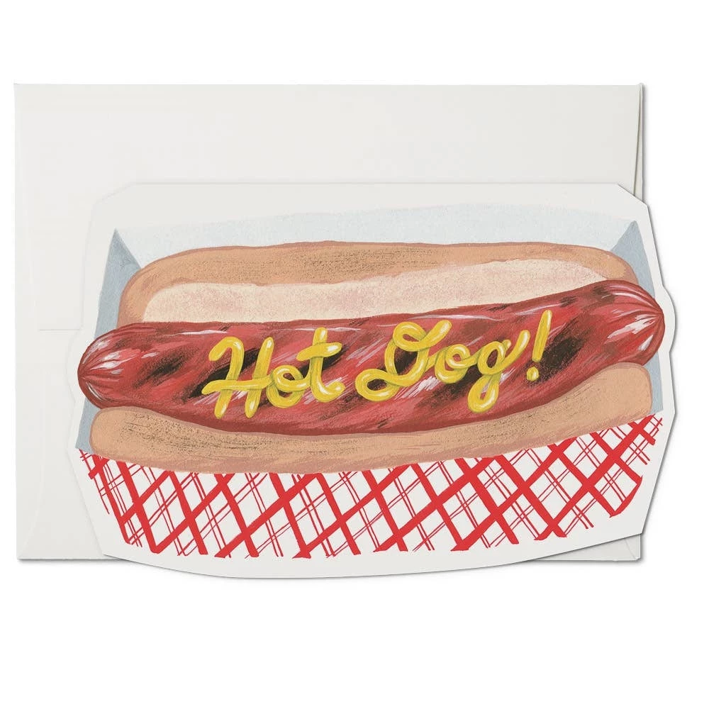 “Hot Dog!” heavyweight card stock offset printed die cut note card, illustrated by Krista Perry.
