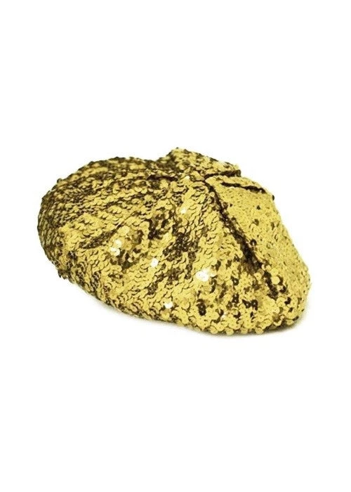 Sparkly fun “French” beret in stretchy knit metallic gold sequinned material–the perfect way to glam up retro or modern outfits!