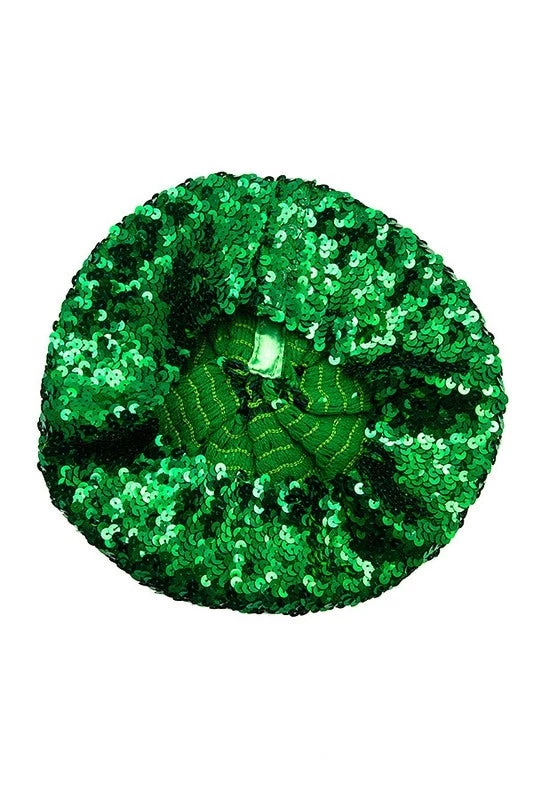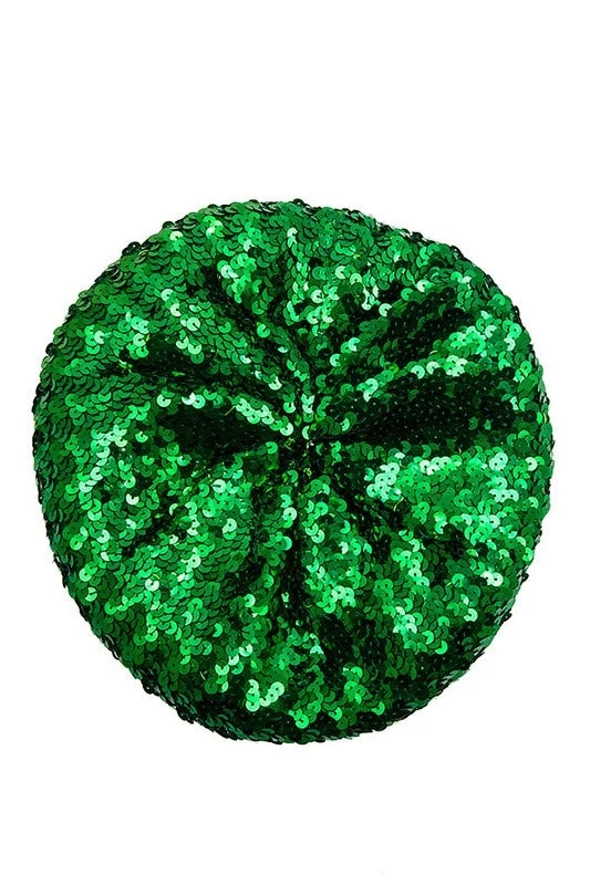 Sparkly fun “French” beret in stretchy knit green sequinned material–the perfect way to glam up retro or modern outfits!