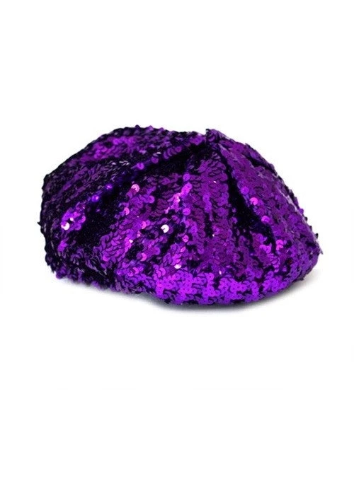 Sparkly fun “French” beret in stretchy knit purple sequinned material–the perfect way to glam up retro or modern outfits!