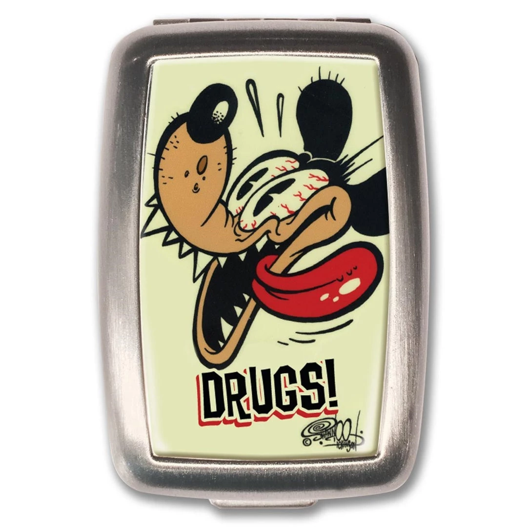 Artist Shawn Dickison’s Outhouse Rat image “DRUGS!” label pill box. This sturdy brushed chrome plated metal container from Retro-a-go-go will hold 14 – 16 average size pills in its two compartment plastic insert.