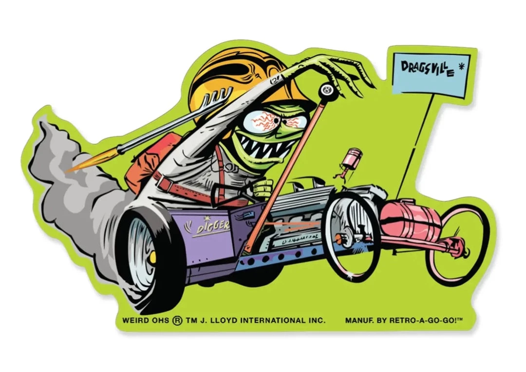 Officially licensed Weird-Ohs die cut vinyl sticker of the classic Dragsville character, based off of the 1963 art by Bill Campbell & the Hawk Model Kit Company. Made by Retro-a-go-go! Studios.