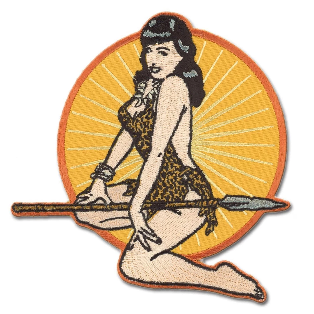 Queen of Pinups, Bettie Page in her iconic leopard print costume, illustrated on a 5″ x 5″ embroidered patch, made by Retro-a-go-go!