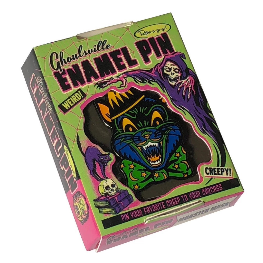 Ghoulsville retro Halloween Crazy Cat 7/8″ x 1 1/4″ enameled metal clutch back pin, made by Retro-a-go-go!