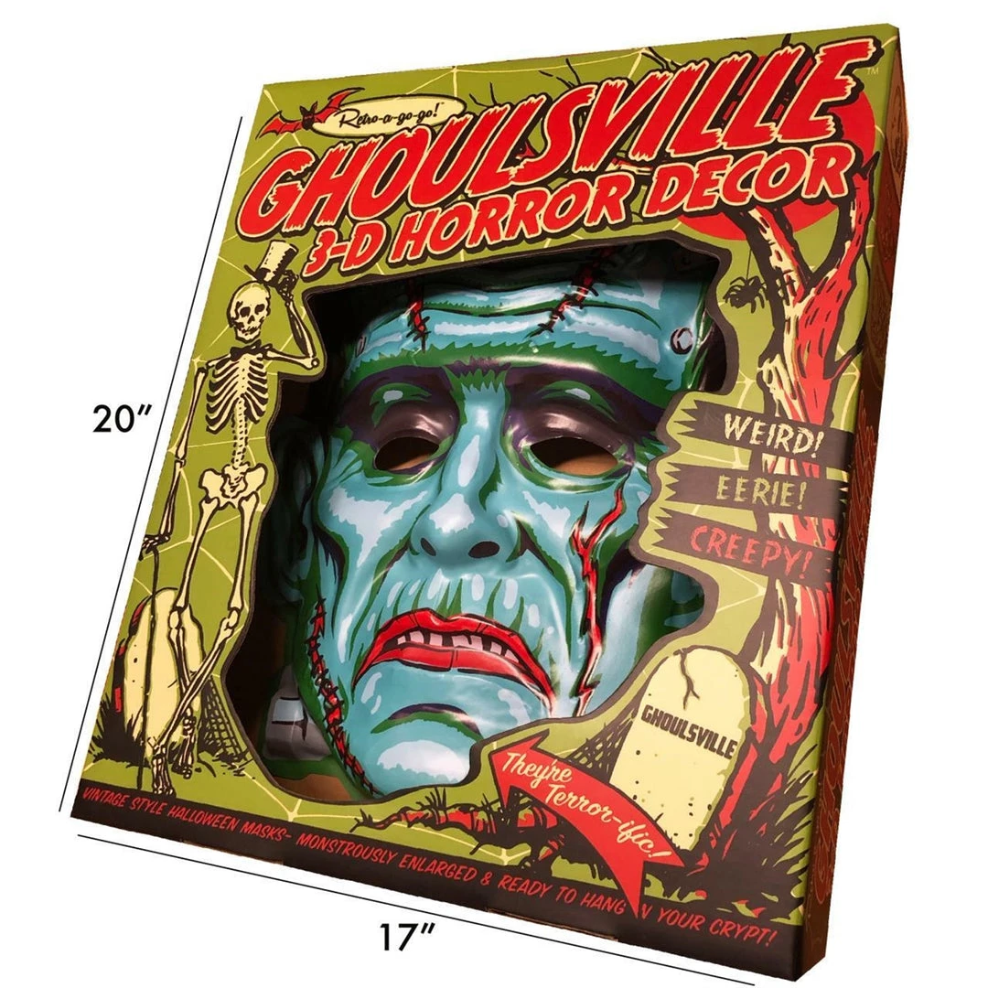 Ghoulsville “Code Blue Frankie” vac-form plastic wall decor, stapled (retro-style –like vintage costume masks) to cardboard backer that has 2″ hole for easy hanging, and packaged in a colorful display box