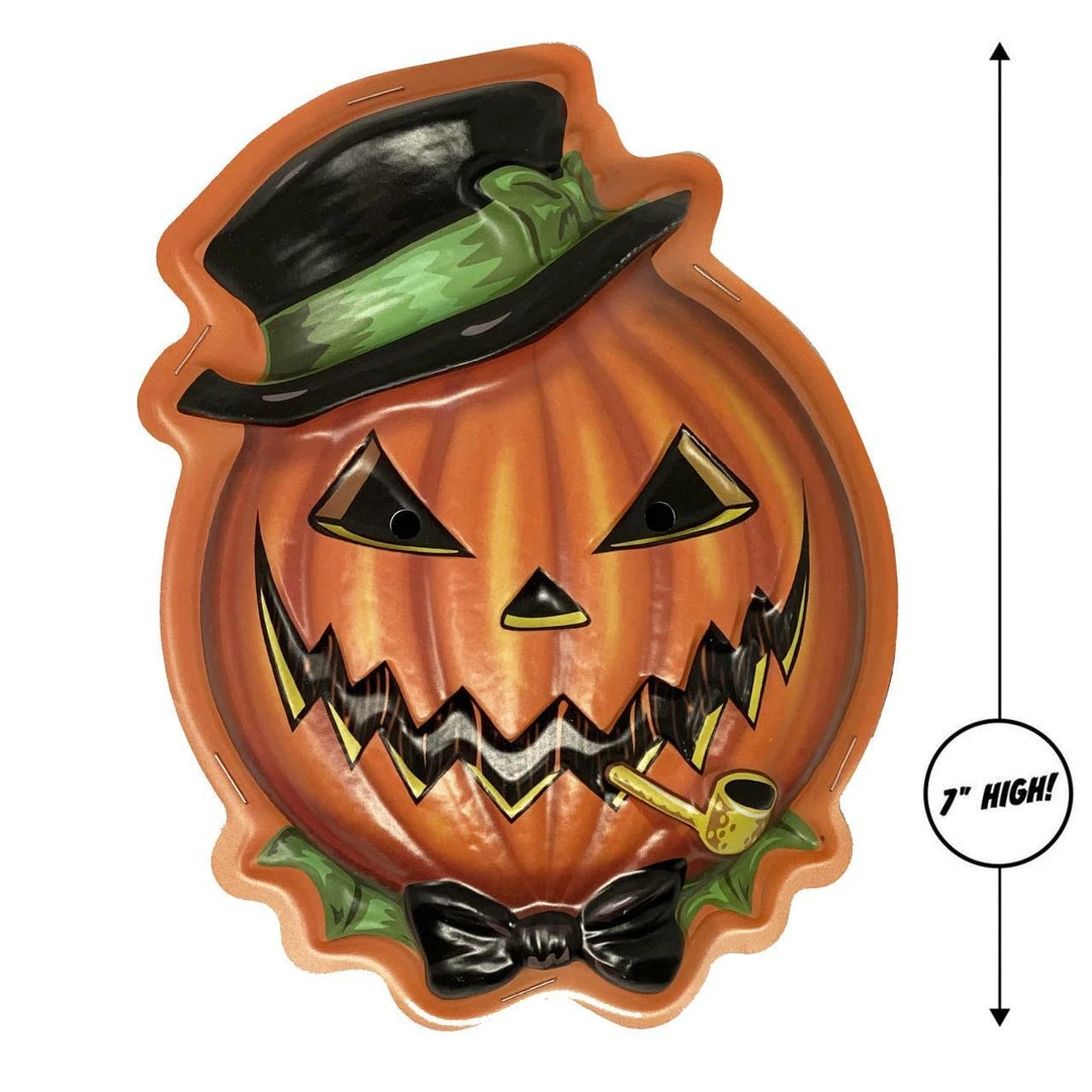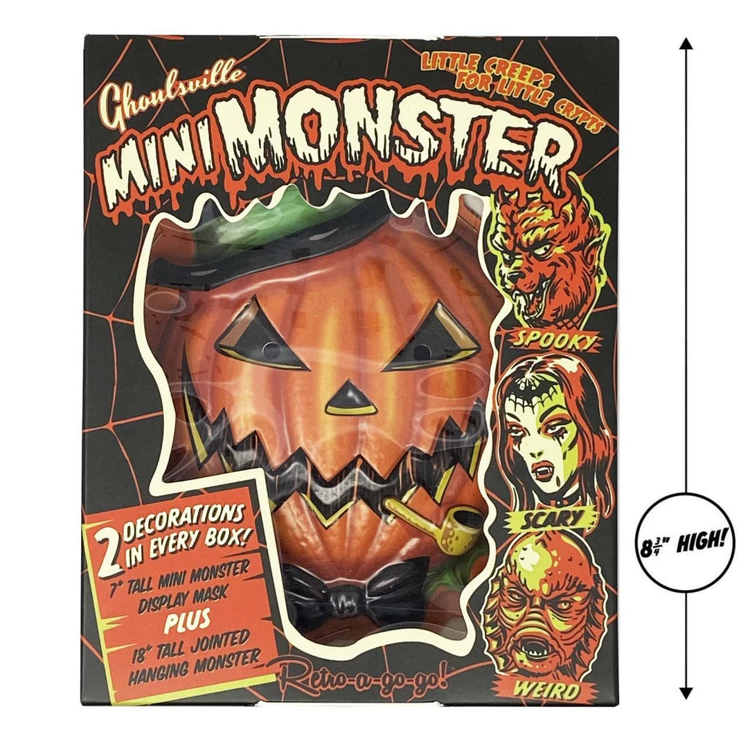 Ghoulsville retro Halloween “Goblin Gourd” 7″ tall ready-to-hang Vac-tastic plastic decor mask and 18″ tall jointed cardstock figure, packaged together in a cool display worthy box!