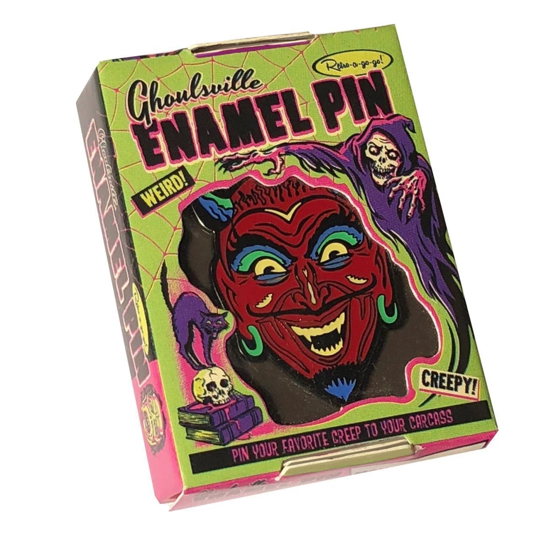 Ghoulsville retro fun house devil 1″ x 1 1/4″ enameled metal clutch back pin, made by Retro-a-go-go!