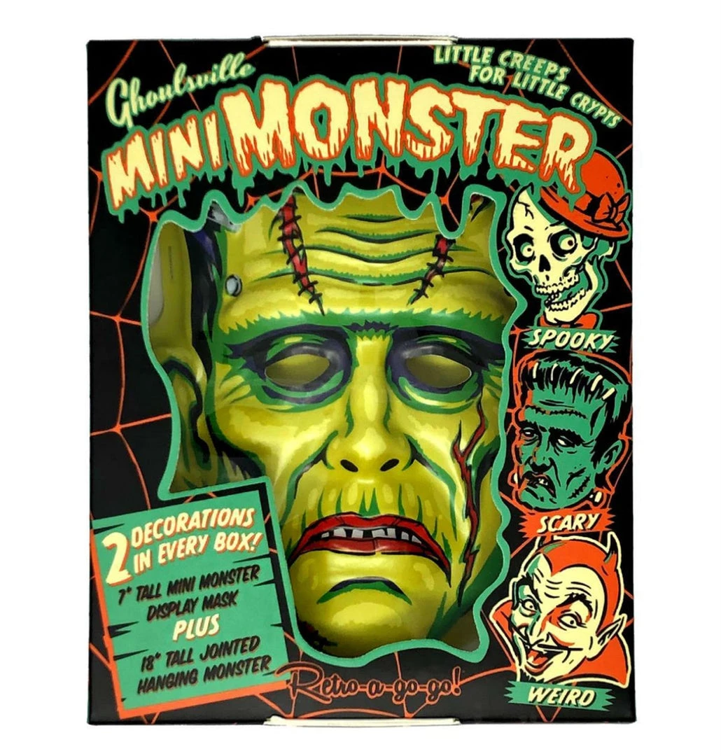 Ghoulsville retro Halloween “Little Frankie” 7″ tall ready-to-hang Vac-tastic plastic decor mask and 18″ tall jointed cardstock figure, packaged together in a cool display worthy box!