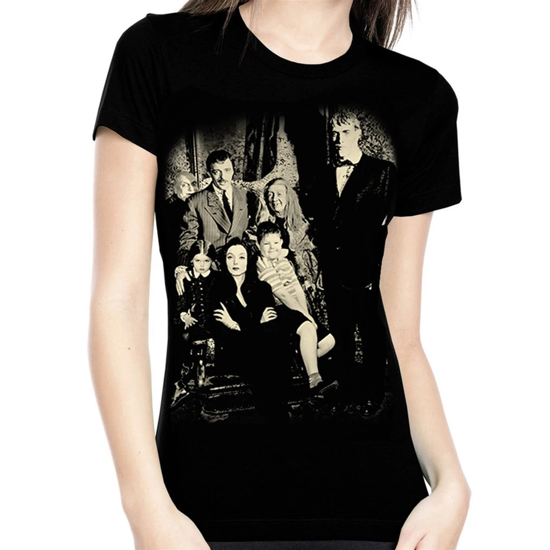 Women’s fitted black t-shirt featuring featuring the creepy, kooky, mysterious and ooky cast of 60s TV show, The Addams Family