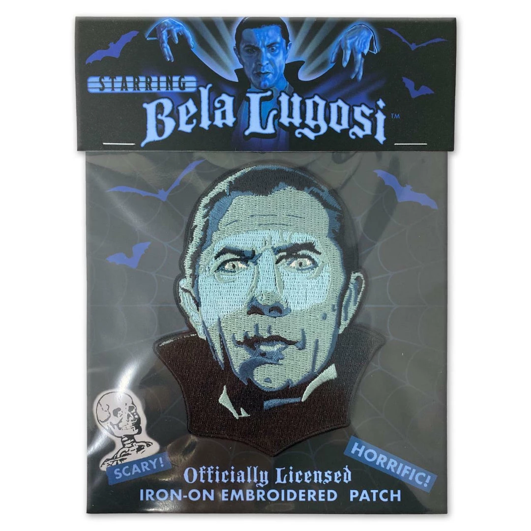 Black & blue grey embroidered patch depicting Bela Lugosi in his iconic role as Count Dracula