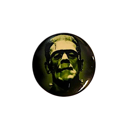 1.25″ round button featuring a black & green image of Boris Karloff in his iconic role as The Monster in the Universal Studios horror classic Frankenstein