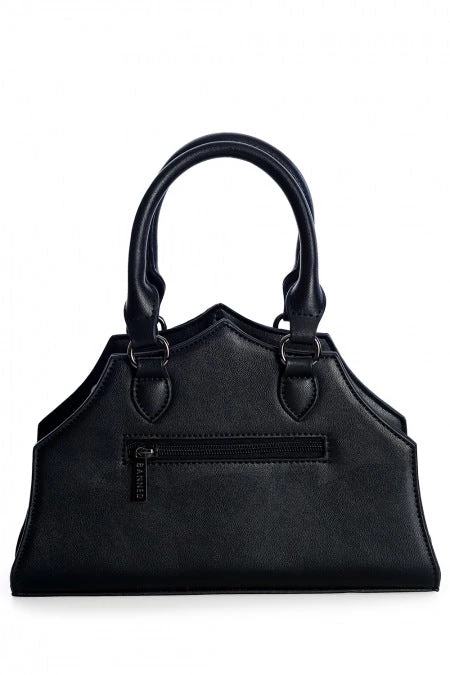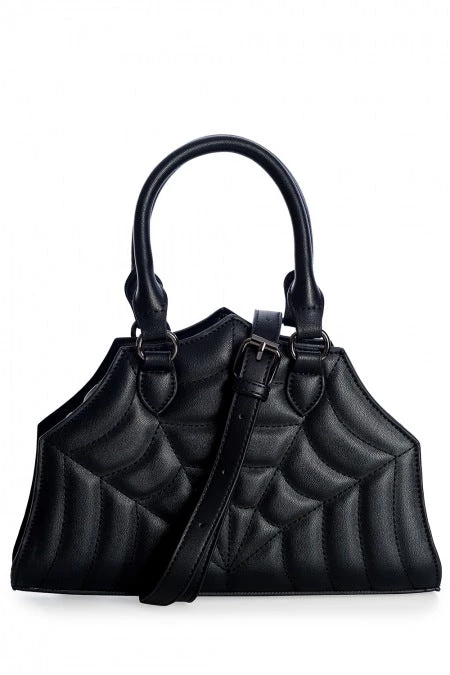 “Sirin” black matte vinyl handbag with spiderweb shape and stitching, made by Banned Apparel. This Halloween-all-the-time style features a zipper closure, outer zip closure pocket, interior zip and open pockets, black fabric lining, and detachable crossbody strap.