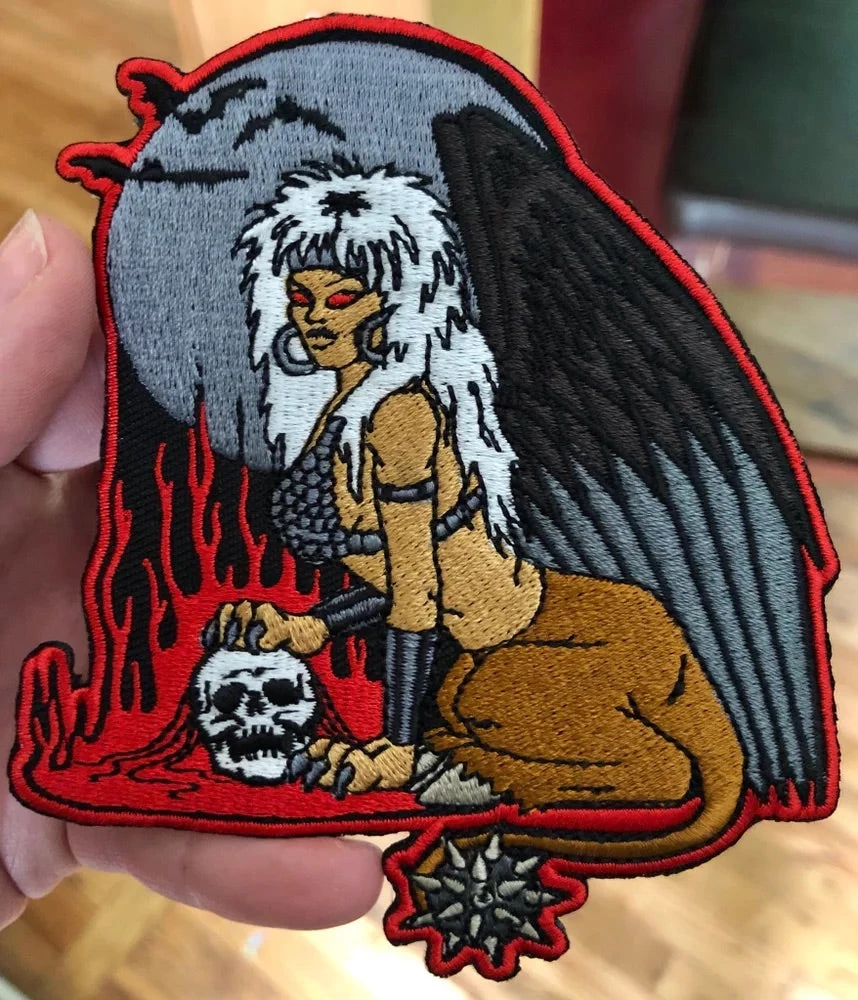 A fully embroidered patch picturing a mystic metal Sphinx babe made by Portland’s own Smelly Elle of Skull Curse Productions!
