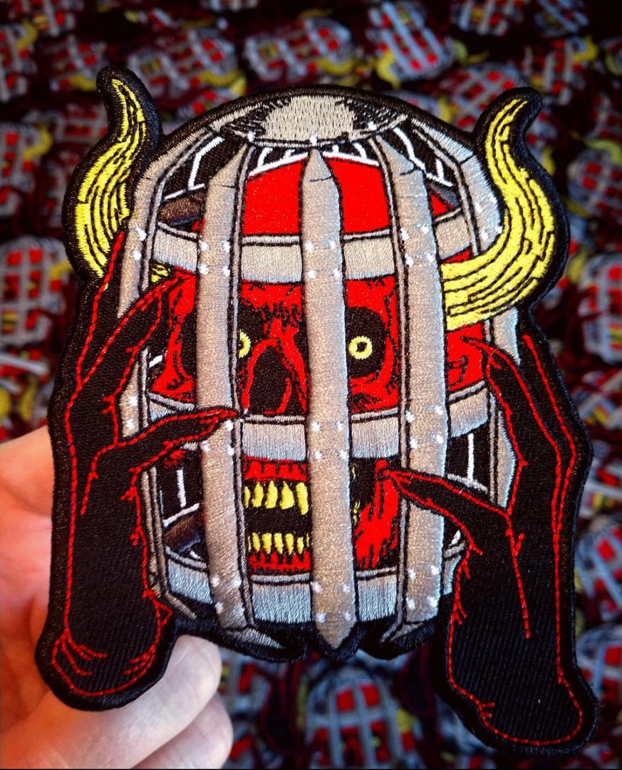 A fully embroidered patch picturing a spooky demonic skull trapped in a steel cage, made by Portland’s own Smelly Elle of Skull Curse Productions!