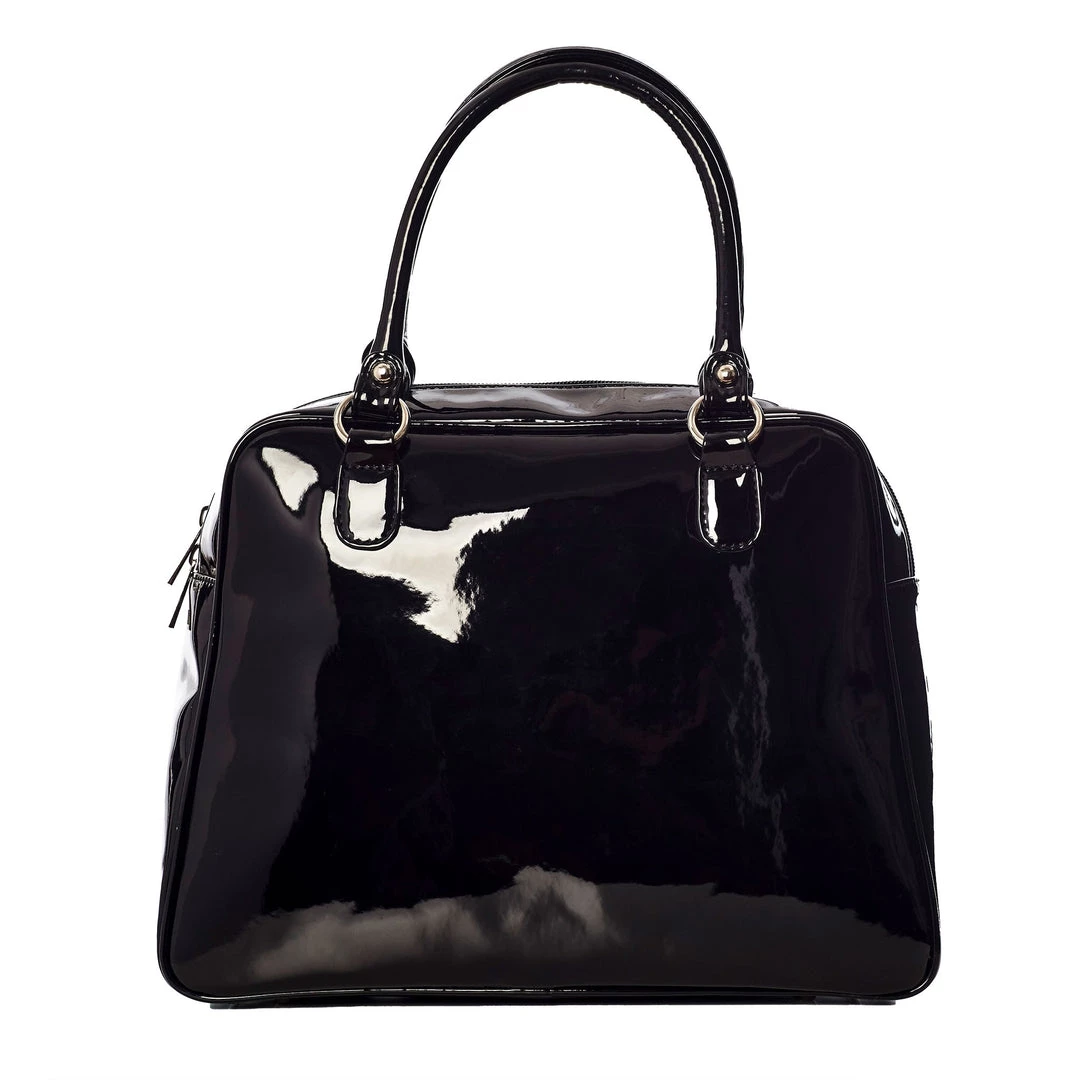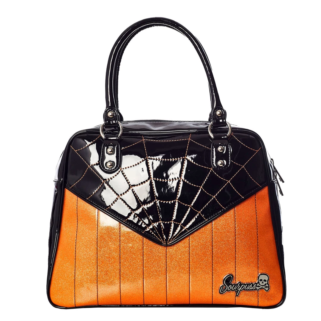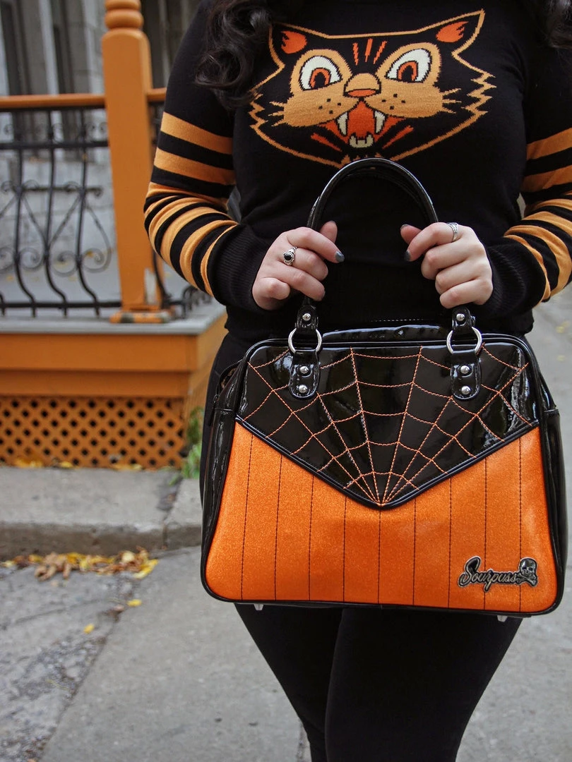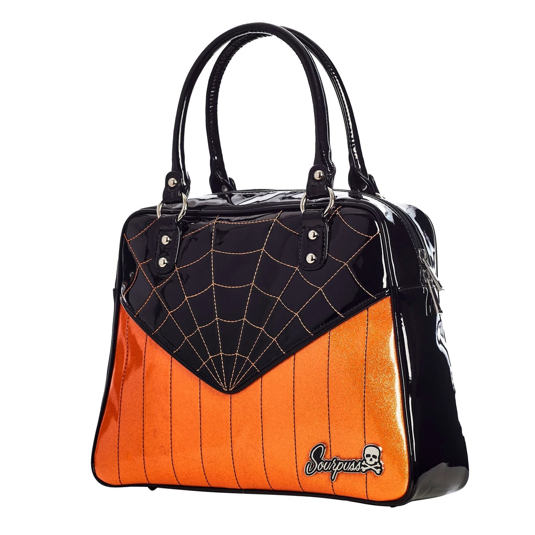 Spooky and Gorgeous! Black & Orange Sparkle Webbed Bowler Purse from Sourpuss, in shiny black vinyl with orange spiderweb stitching and glitter orange front panel. This striking style is in a roomy larger size, making it a great everyday, or even overnight, bag.