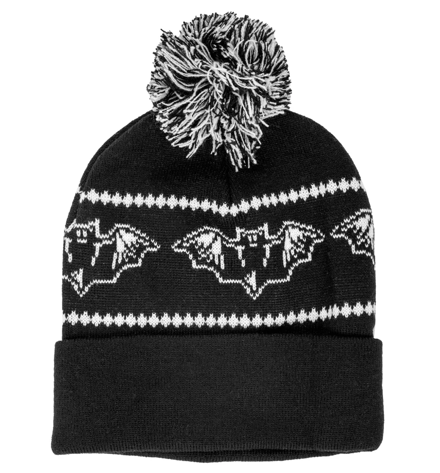 Cozy black knit hat with white Nokturnal Bats knit-in design and pom-pom top