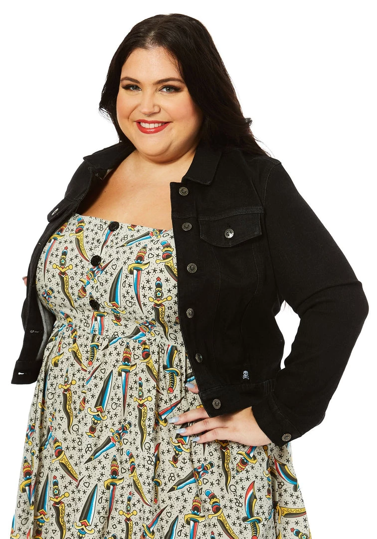 The perfect topper for casual outfits, day or night –classic black long sleeve denim jacket in a slightly cropped length, featuring Sourpuss branded buttons, chest pockets, inside pockets, AND hand pockets –yay!