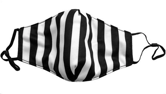 Soft and comfortable Beetlejuice-y vertical black & white stripe polyester knit shaped face mask with cotton lining/filter