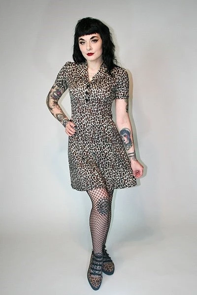 Our favorite dress style from Sourpuss has been updated with more bust-friendly button placement (yay!) and is now available in one of our all-time favorite prints!! The “diner” style short sleeve collared Rosie Dress features a three button closure bodice, above the knee length, and a-line silhouette –the classic leopard print is sure to make this version a sassy wardrobe staple