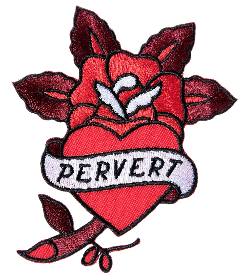 Classic tattoo flash image of a rose and banner decorated heart, this one with “Pervert” on the banner–a great way to avoid wasting time talking with someone who wouldn’t be happy to see it!