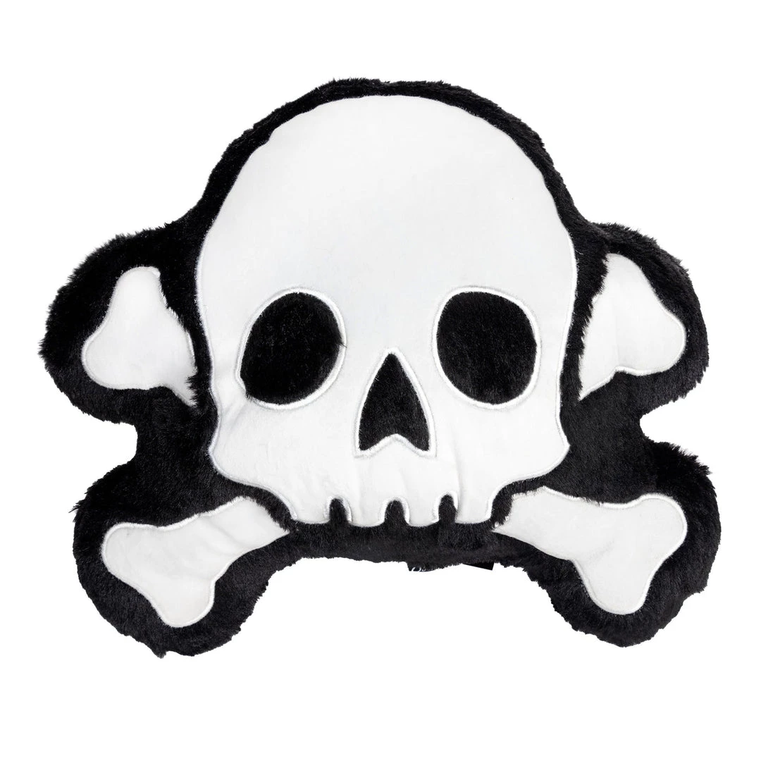 The perfect place to rest your weary cranium! Super plush black faux fur with embroidered white details skull & crossed bones shaped pillow. Made by Sourpuss Clothing