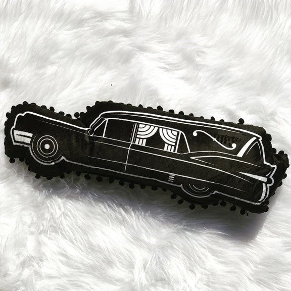 The perfect place to rest your weary head! Soft and squishy black & white fleece hearse-shaped pillow, with black fuzzy pom-pom trim. Made by Sourpuss Clothing