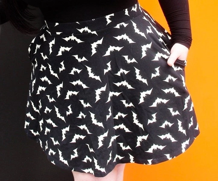 Soft and stretchy cotton knit “Luna Bats” print black with cream skater skirt, featuring comfortable elastic waistband, sassy length, and pockets, yay! Made by Sourpuss Clothing