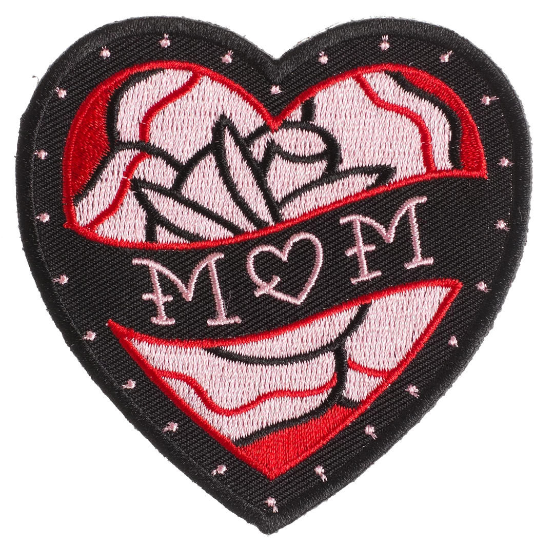 “MOM” tattoo flash style banner with pink rose on black heart-shaped embroidered iron or sew on patch, made by Sourpuss Clothing