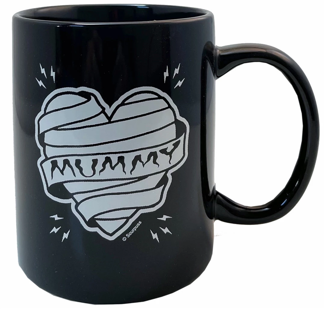 “Mummy” bandage banner heart in white on black ceramic mug, made by Sourpuss Clothing