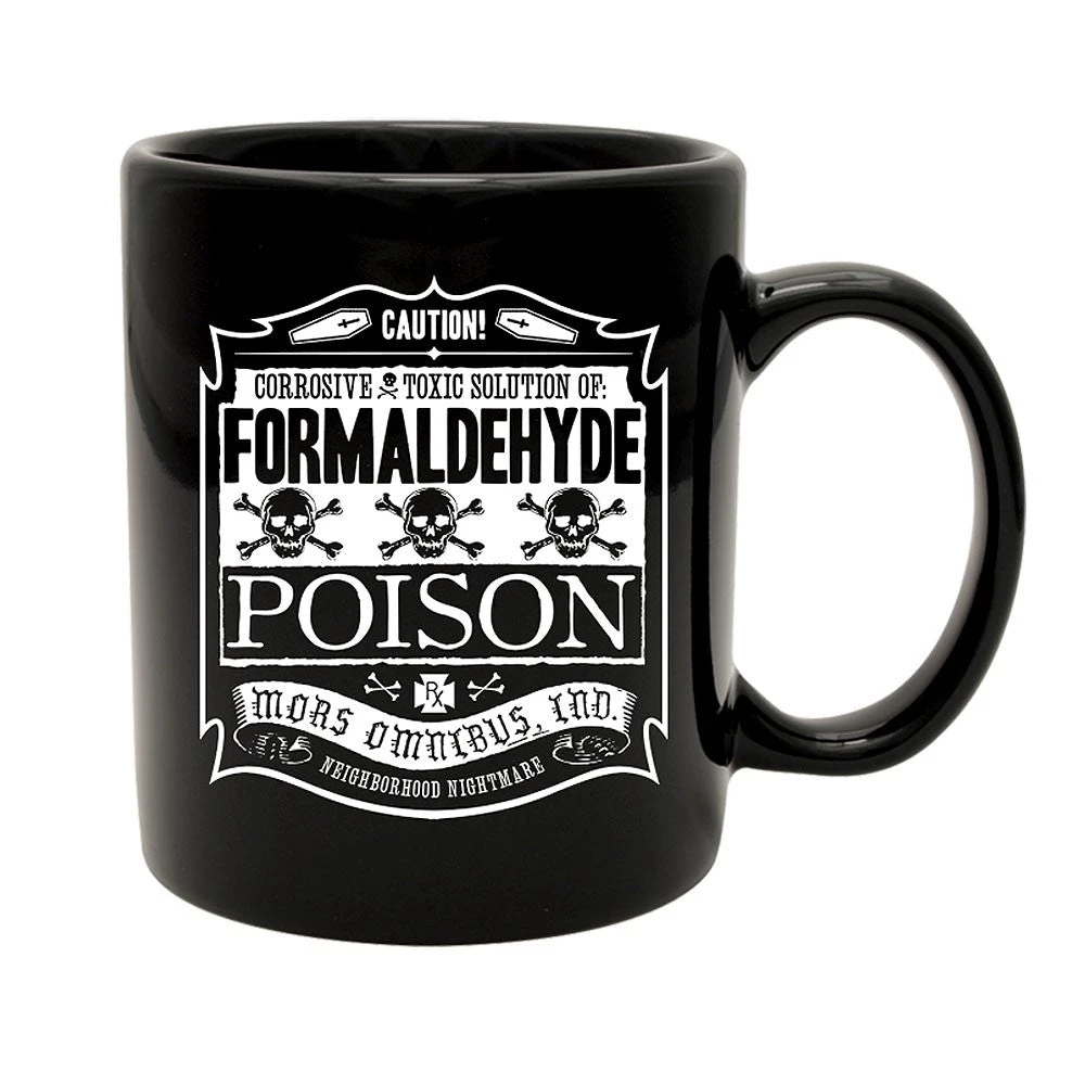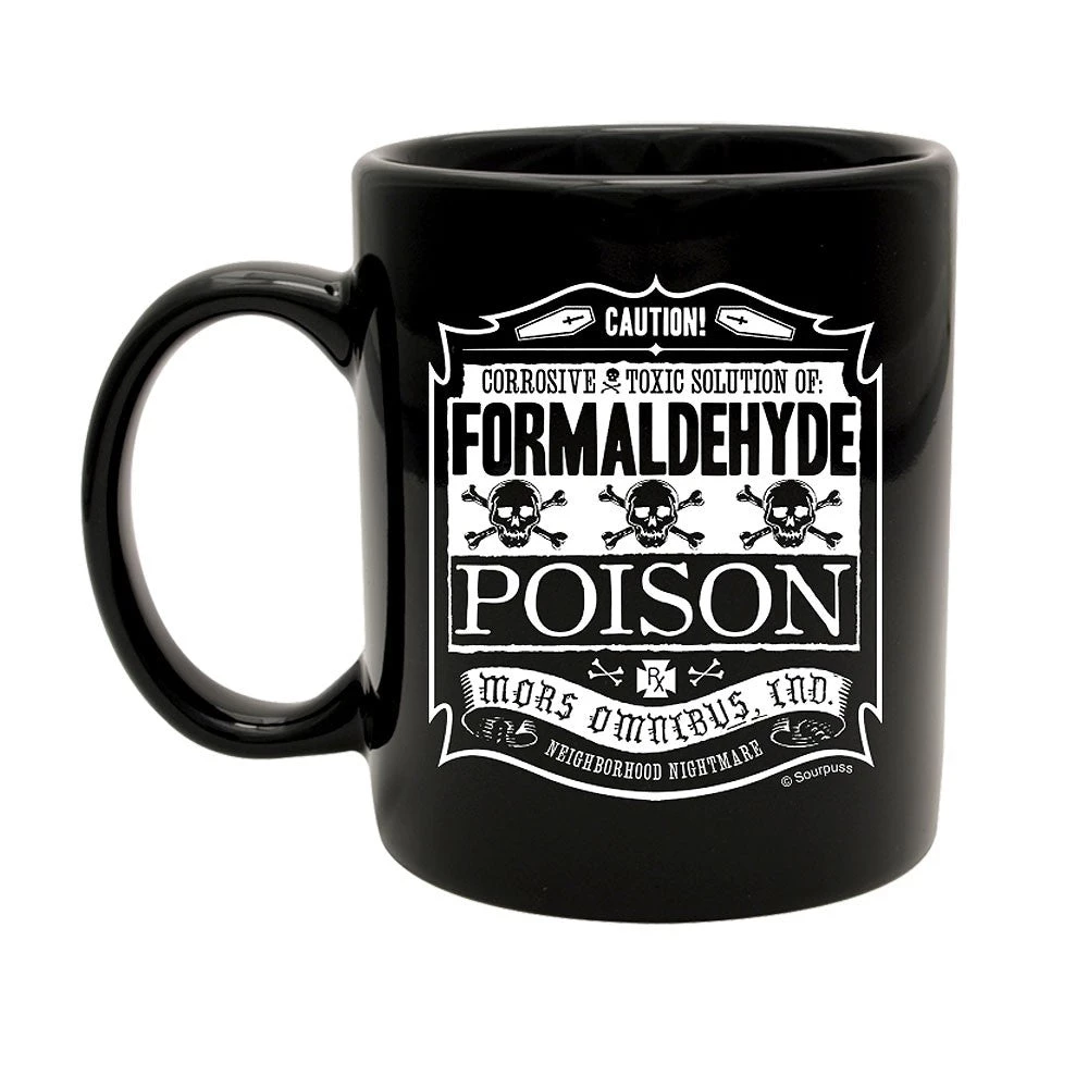 Vintage-style “Poison” label front & back print in white on black ceramic mug, made by Sourpuss Clothing