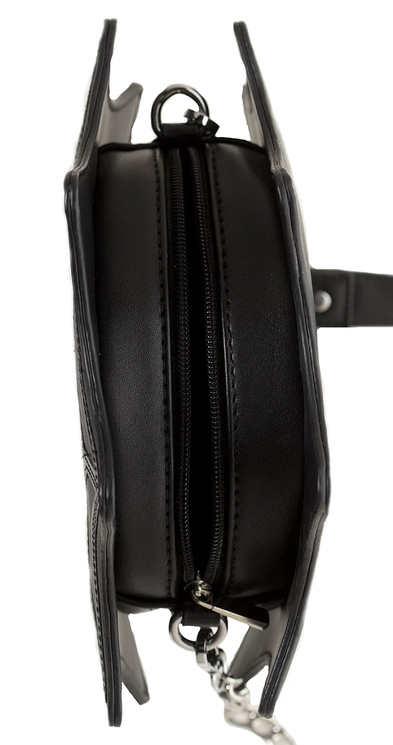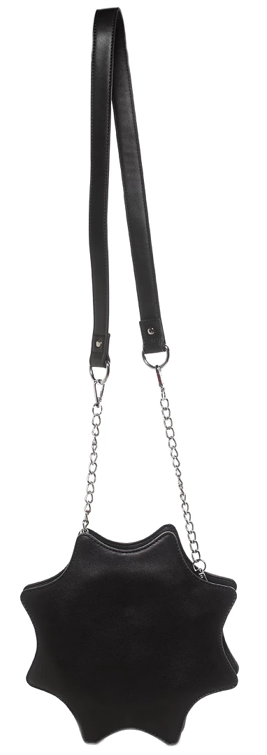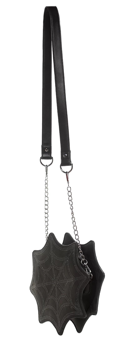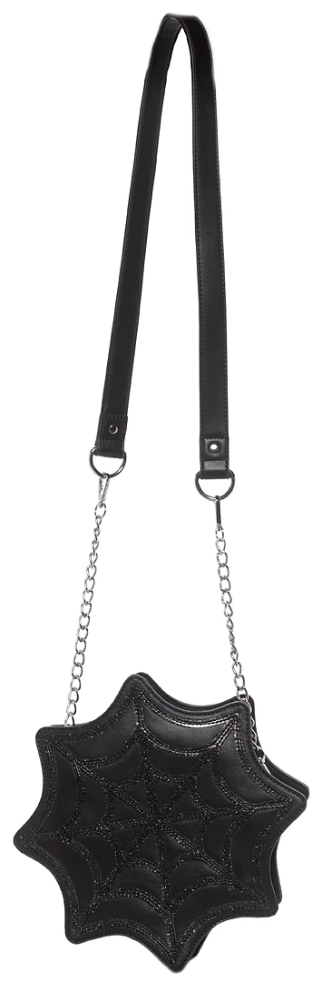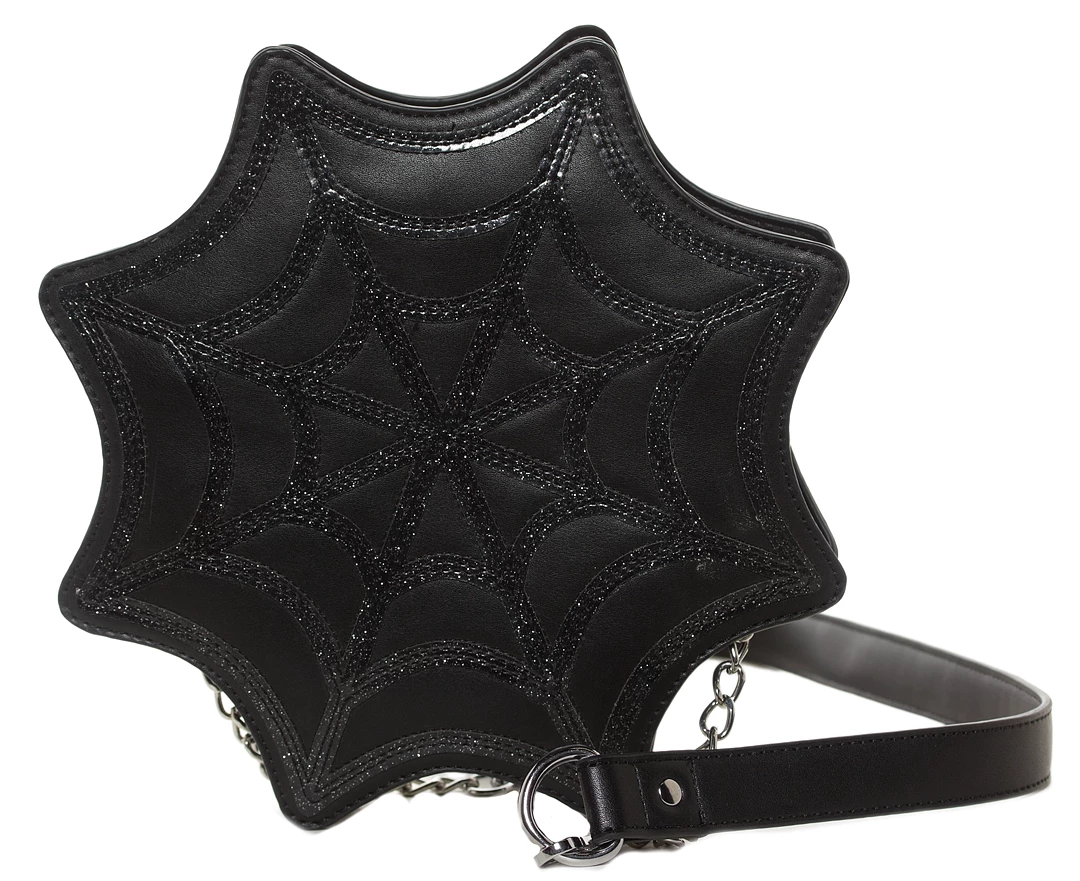 Black on black (our favorite color combo!) sparkle and matte vinyl spiderweb purse from Sourpuss. This Halloween-all-the-time style features a zipper closure, satin lining, and detachable crossbody strap.
