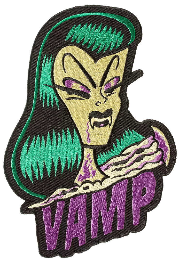 Watch out! …the lady is a Vamp. Green-haired fanged beauty by artist Sol Rac, oversized embroidered patch to display on your vest or jacket.