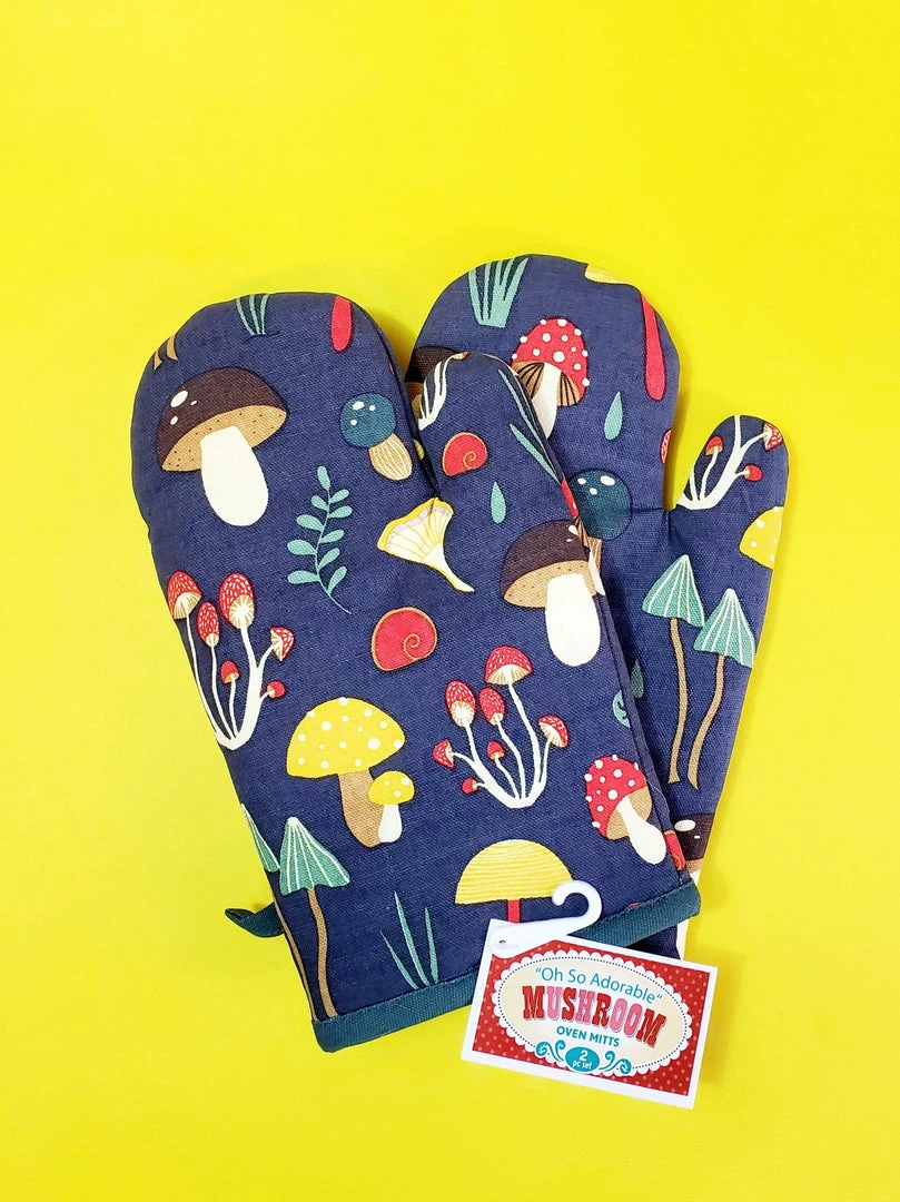 Sass up your kitchen accessories! Practical cotton oven mitt set in blue with allover woodsy toadstool mushrooms print and hunter green trim, made by Streamline.