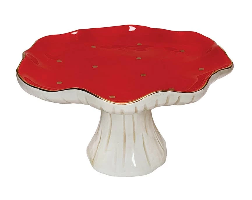 Red, creamy beige, and metallic gold hand-painted ceramic toadstool mushroom shaped pedestal trinket dish –perfect for displaying tiny treasures, or maybe a mini cake!