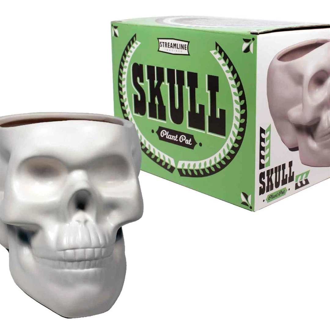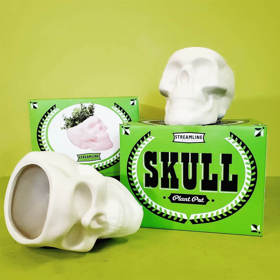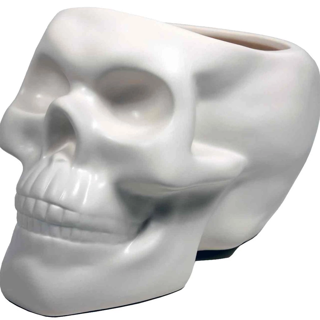 Anatomical Skull Planter in matte finish bone white ceramic –a perfect way to show off a fave plant buddy and give this macabre noggin’ some green ideas!