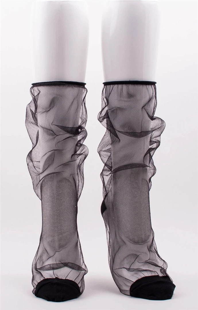 So pretty! Sheer black tulle crew length socks with solid black toe, heel and narrow top band