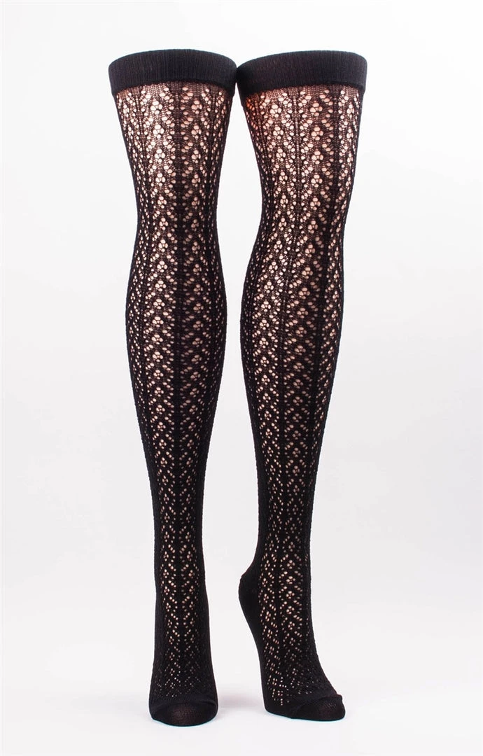 These black over the knee crochet socks are designed to be lightweight and breathable so they can be worn in all seasons, with a top cuff that stays up comfortably without digging into your thighs!