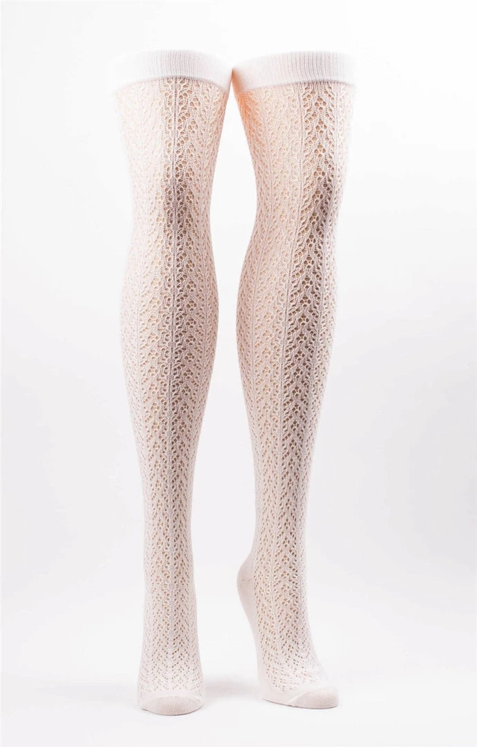 These creamy ivory over the knee crochet socks are designed to be lightweight and breathable so they can be worn in all seasons, with a top cuff that stays up comfortably without digging into your thighs!